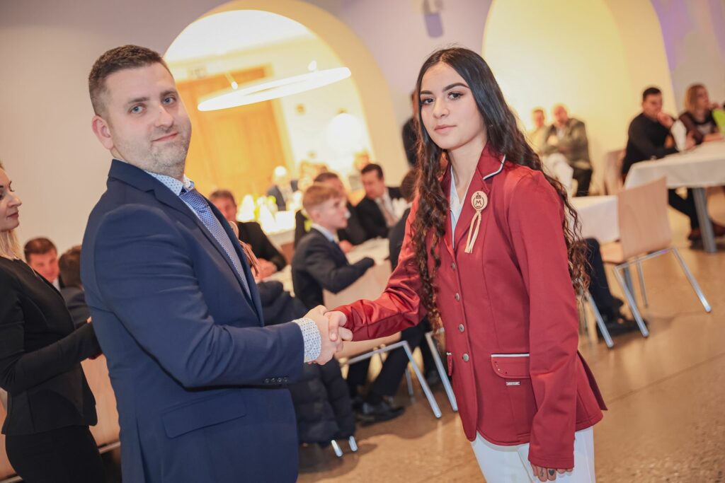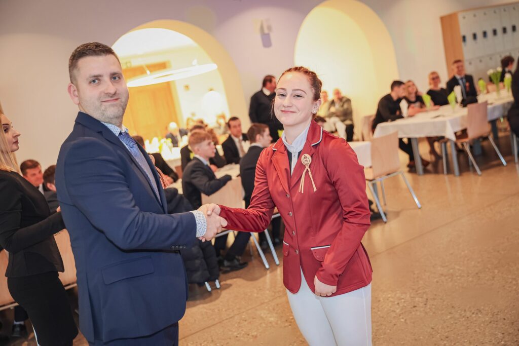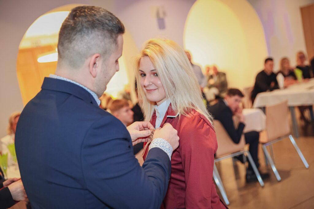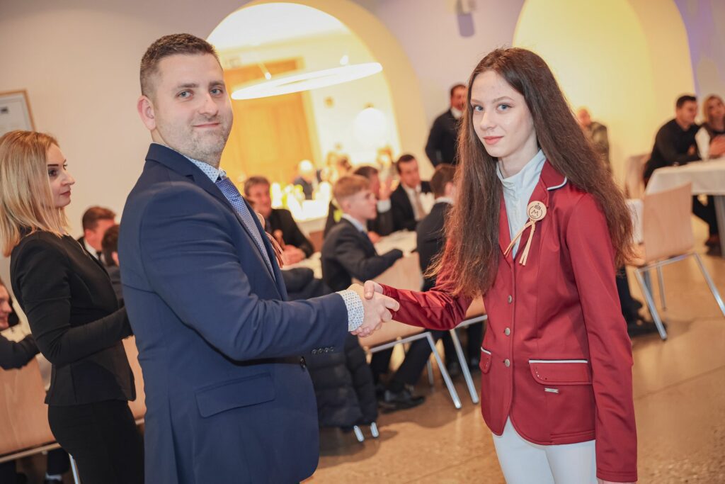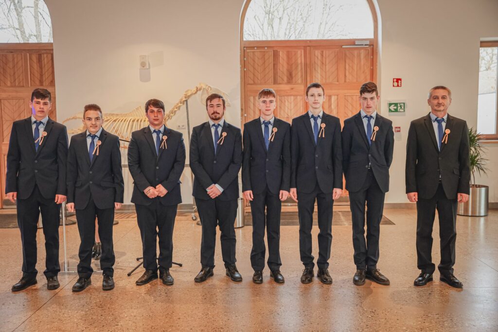 Kovács Petra 12.A osztályos tanuló tűzte fel az első szalagokat az iskolavezetés tagjainak, ezt követően Igazgató Úr tűzte fel a szalagokat az osztályfőnököknek és Perity Endre szakmai elméleti oktatónak. A lószerszámok fonottsallangos díszítését megidéző, a Ménesbirtok címerét hordozó bőrkorongokat a makói Lenhardt Béla szíjgyártó mester készítette el.
