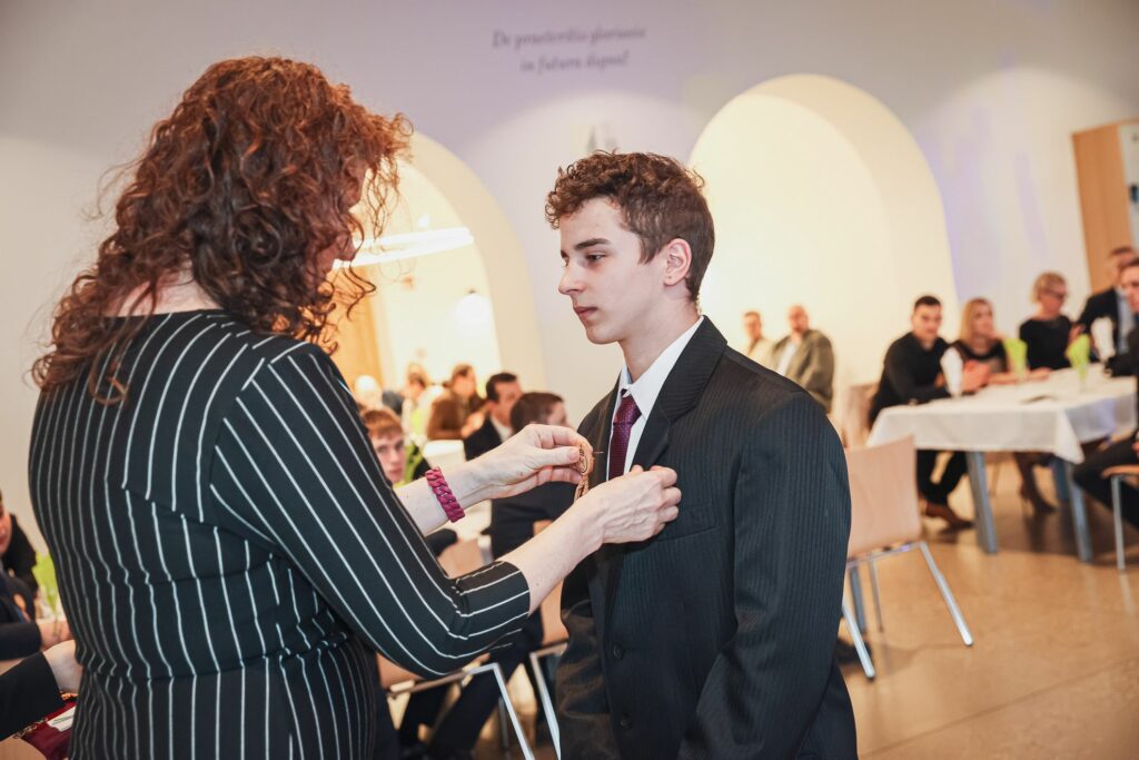 Hagyományaink szerint az osztályok egymás után vonultak fel az aulában, ahol az osztályfőnökeik tűzték fel a tanulóknak a szalagokat, miközben a háttérben kivetítőn láthattunk róluk kisgyermekkori és jelenkori fotókat.