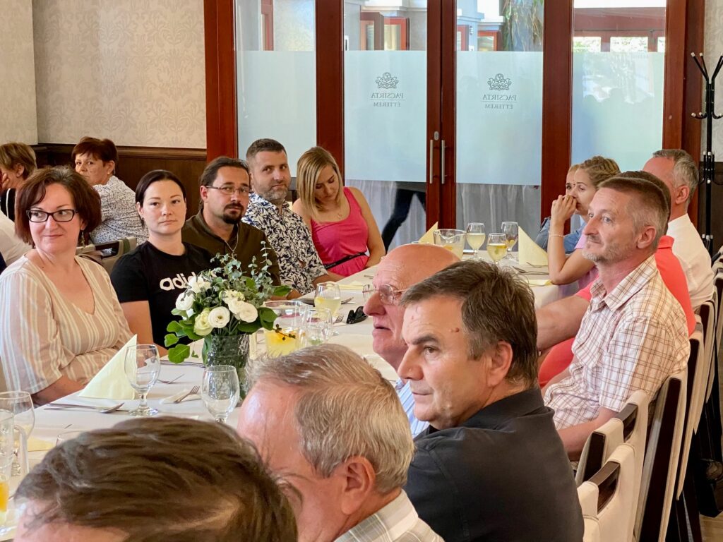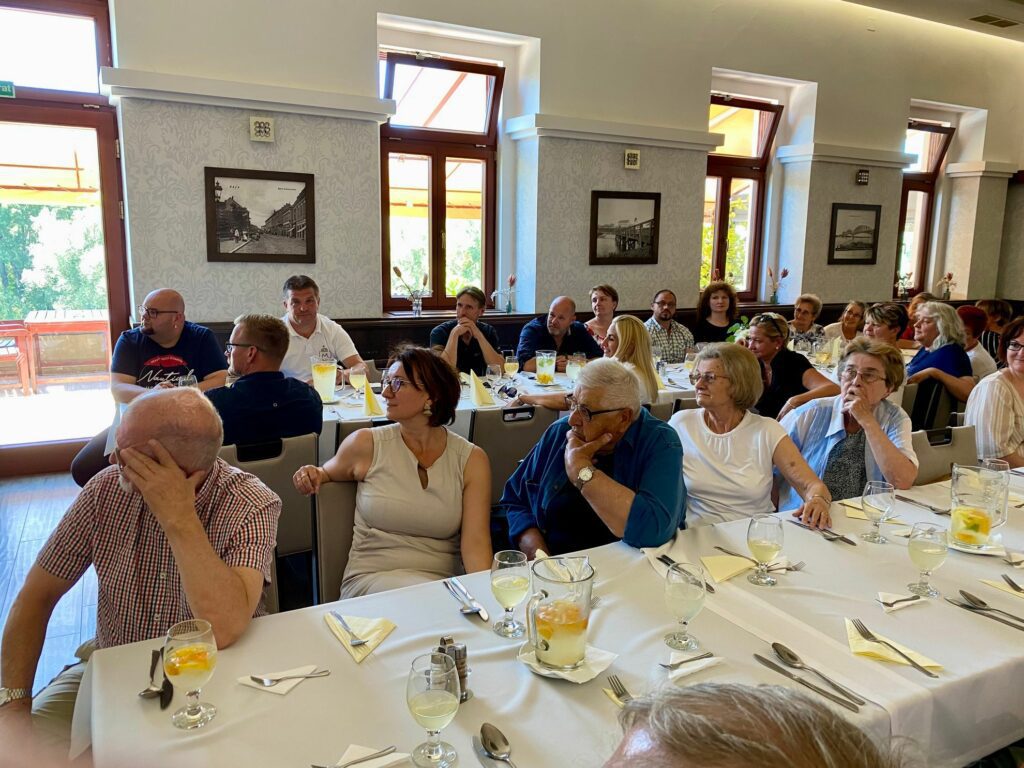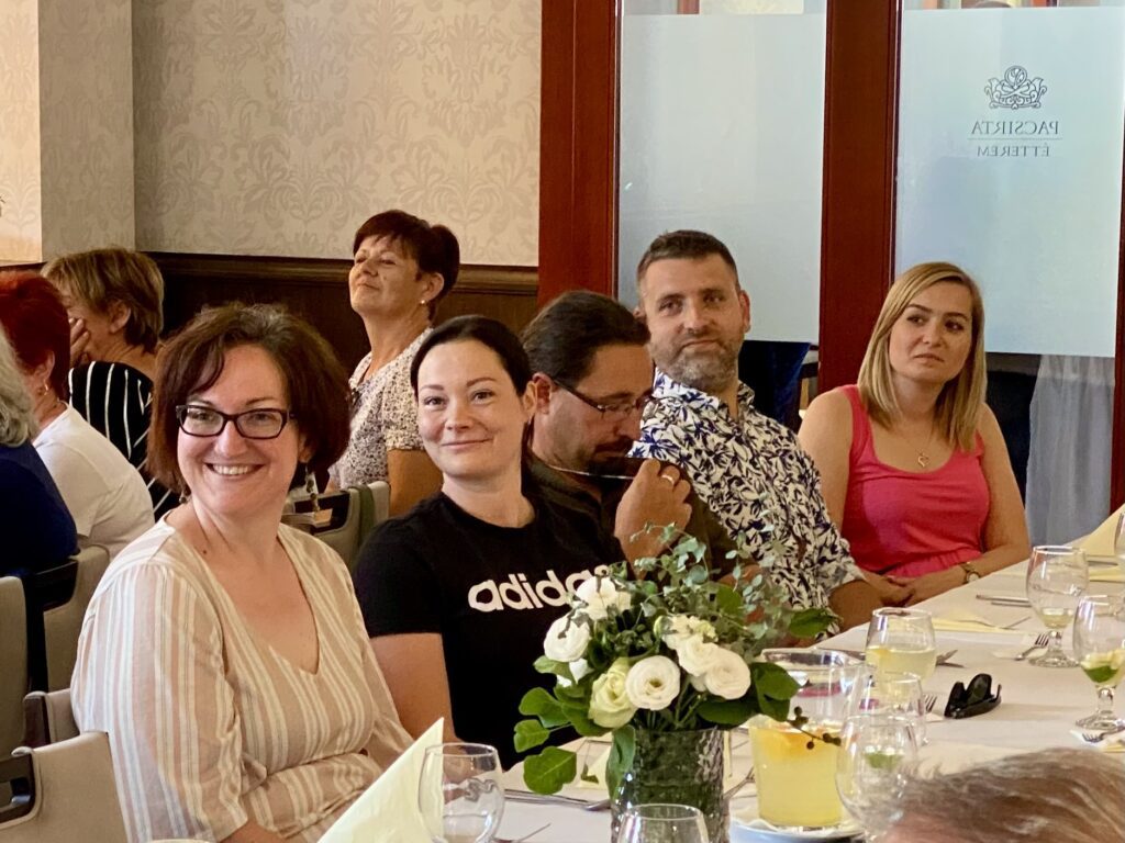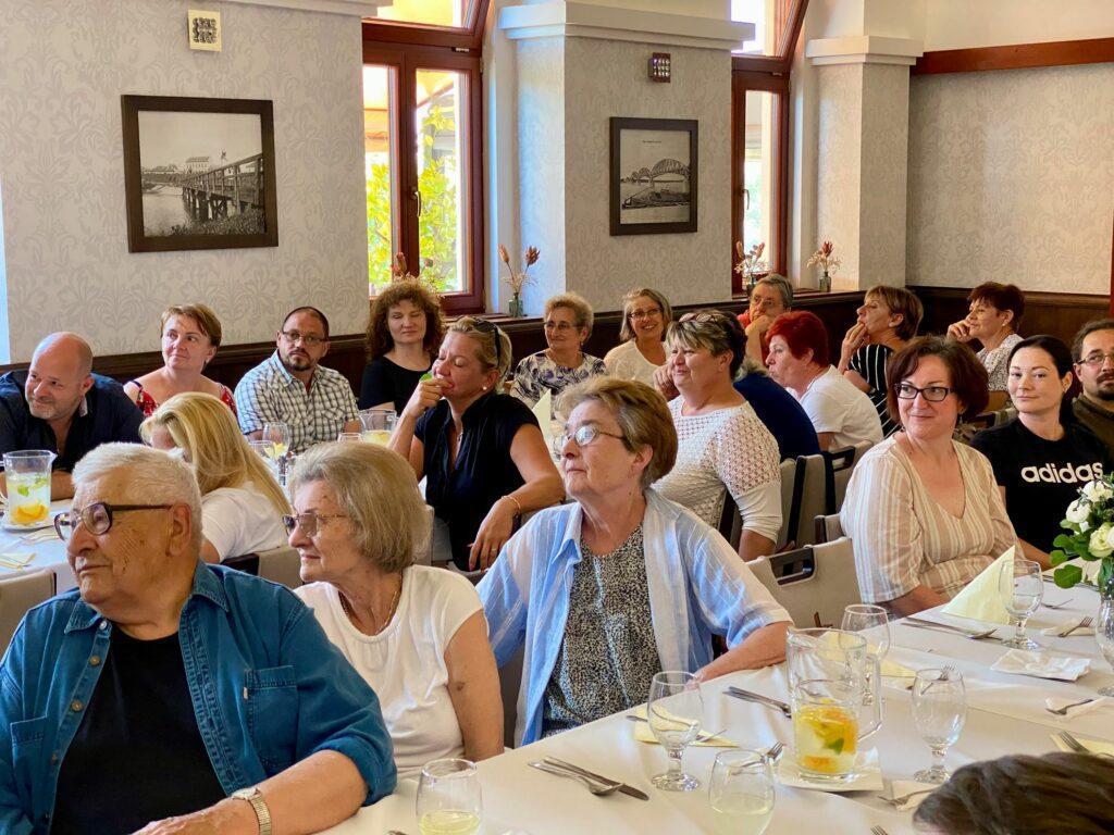 Miután rövid utazást tettünk a Gemenci Erdei Vasúton, gyalogosan is felfedeztük az ártéri erdőt és még egy kilátóba is feljutottunk. A svédasztalos ünnepi ebédet Baján a Duna Wellness Hotel (****) konferenciatermében költöttük el. Tarkó Gábor igazgató úr köszöntötte nyugalmazott munkatársainkat, az aranydiplomás Árpási Erzsébetet és Tarkó Mihály Miklósnét, Benczik Ferencnét és Krucsóné Gergely Erzsébetet. Elfogadták meghívásunkat Csanádi István igazgató úr, a vasdiplomás Szabó Barna, valamint Deth Lajos, Mesterházi János és Takács Ferenc nyugdíjas munkatársaink. Az iskolavezetés tagjai a hölgyeknek csokoládéval, az uraknak egy-egy üveg jó borral kedveskedtek.